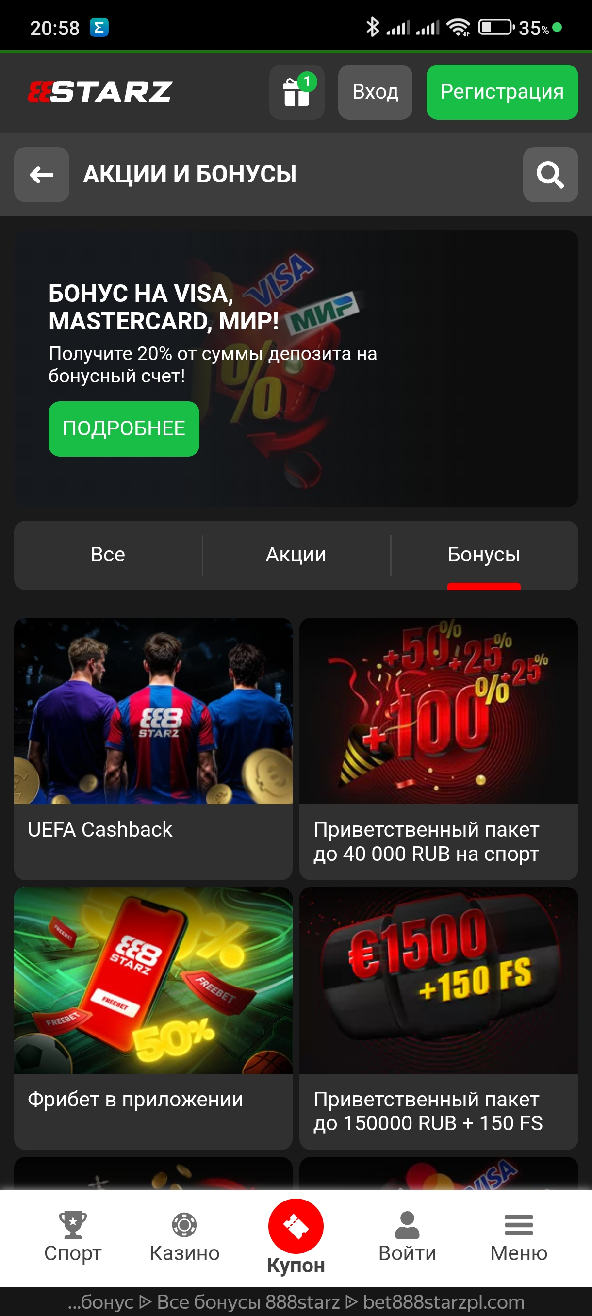 Всего есть 4 приветственных бонусов в казино и в спорте,которые будут доступны после того,как был отыгран предыдущий бонус.