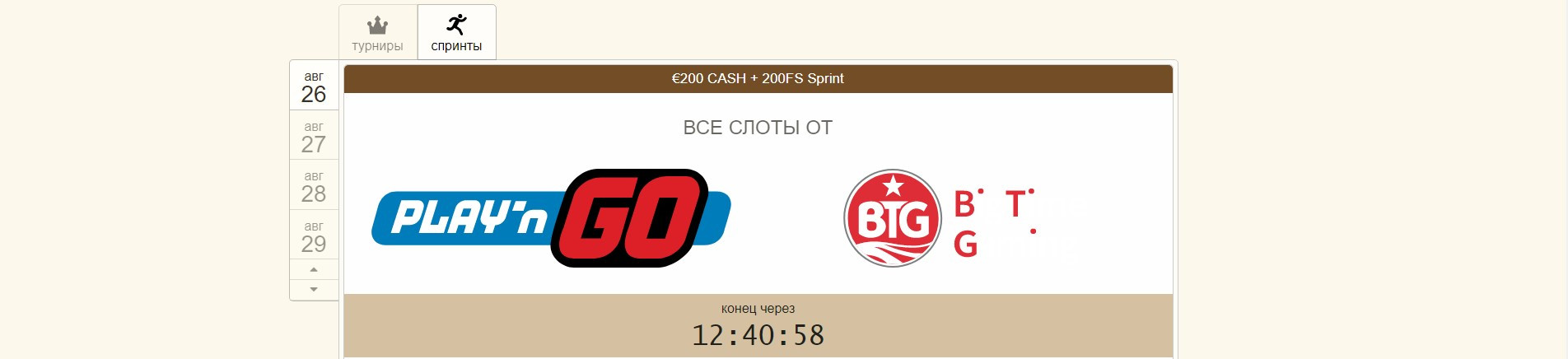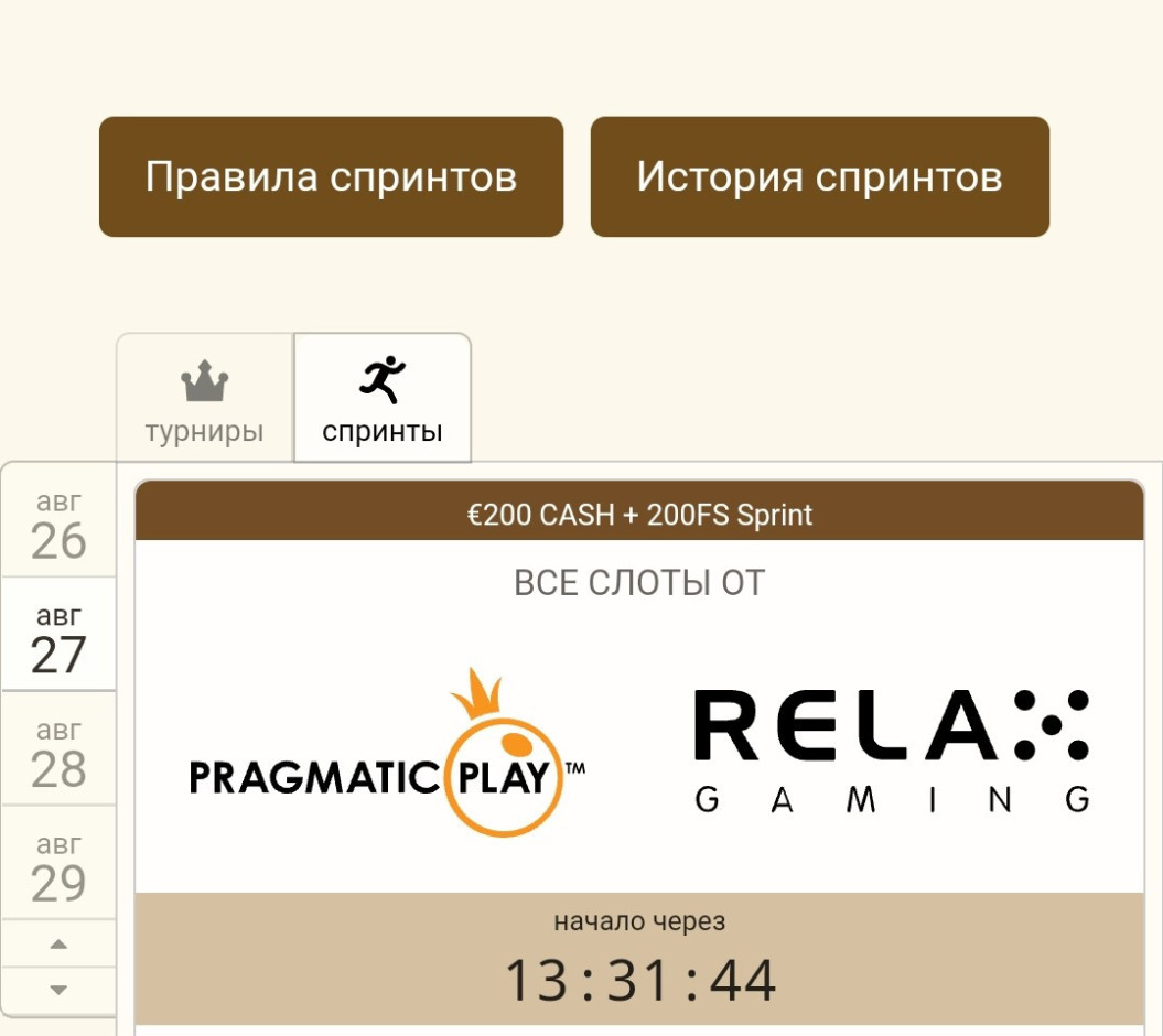 Для этого случая в казино Everum существуют ещё ежедневные Спринт-турниры,играя в которых Вы можете выиграть вполне достойные призы.Чтобы участвовать в таких спринтах,Вам нужно войти во вкладку "турниры" и войти в "спринты"