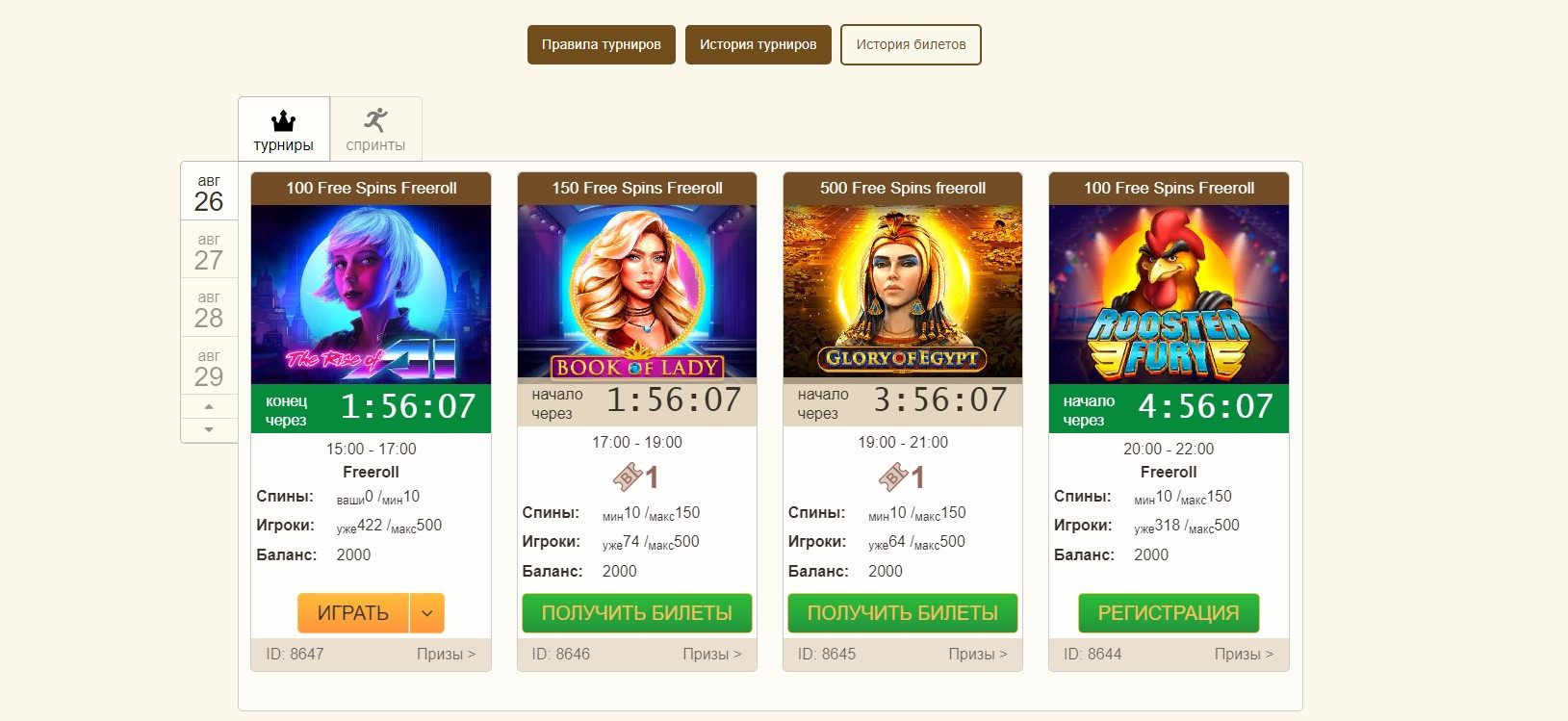 Эти турниры полностью бесплатные,но призы вполне реальные.Вы можете выиграть фриспины,бонусы,золотые монеты или денежный приз.